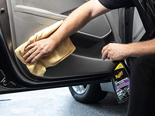 Details: Use Meguiar’s Quik Interior Detailer Cleaner to quickly and easily clean your car’s interior surfaces, including plastics, vinyl, leather, rubber, metal and even LCD and navigation screens. The gentle, high-lubricity formula quickly cleans, lifting dust, dirt, grime and spills while restoring the original appearance of all interior surfaces. Sun-blocking agents in this interior protectant guard against aging, fading, cracking and drying, while an improved deeper cleaning formula leaves a dark, rich shine without a greasy appearance or feel. Great for fast touch-ups, this interior car cleaner comes in a convenient spray bottle for easy application.